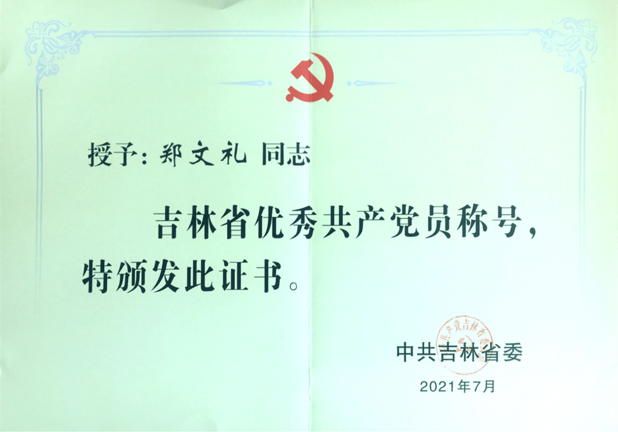 在中國(guó)共產(chǎn)黨建黨100周年即將來(lái)臨之際,2021年6月28日上午,吉林省委召開(kāi)全省“兩優(yōu)一先”表彰大會(huì),我公司鄭文禮同志被授予“優(yōu)秀共產(chǎn)黨員”稱號(hào)。